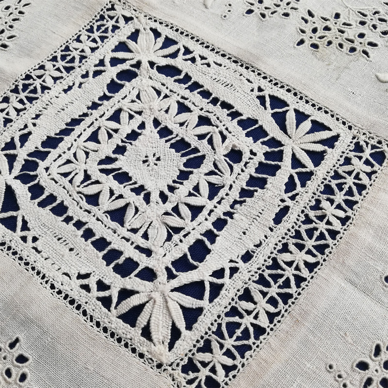 小さな花びらのカットワークが美しく、中央と周囲はボビンレースで飾られ個性て的な一枚になっています。