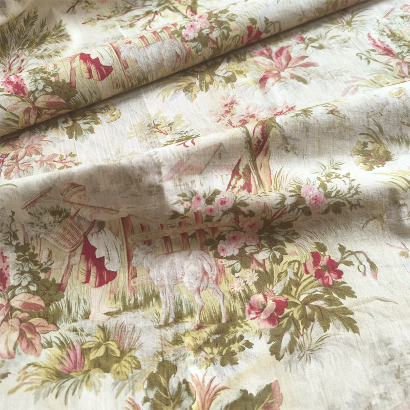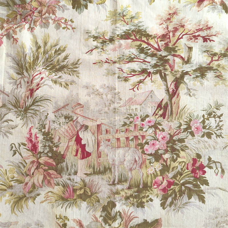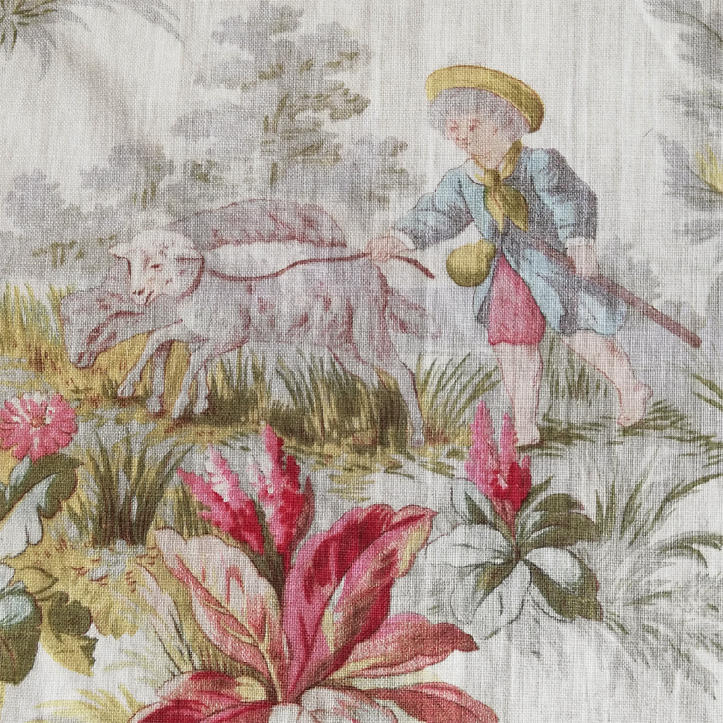 多色トワルドジュイと呼ぶとしっくりくる様な羊飼いの少年少女と木々や花々が描かれたファブリックです。