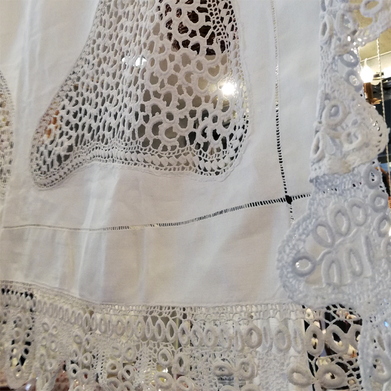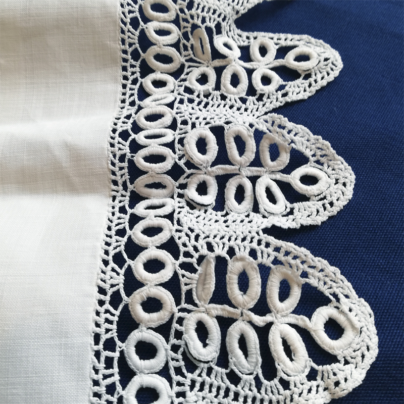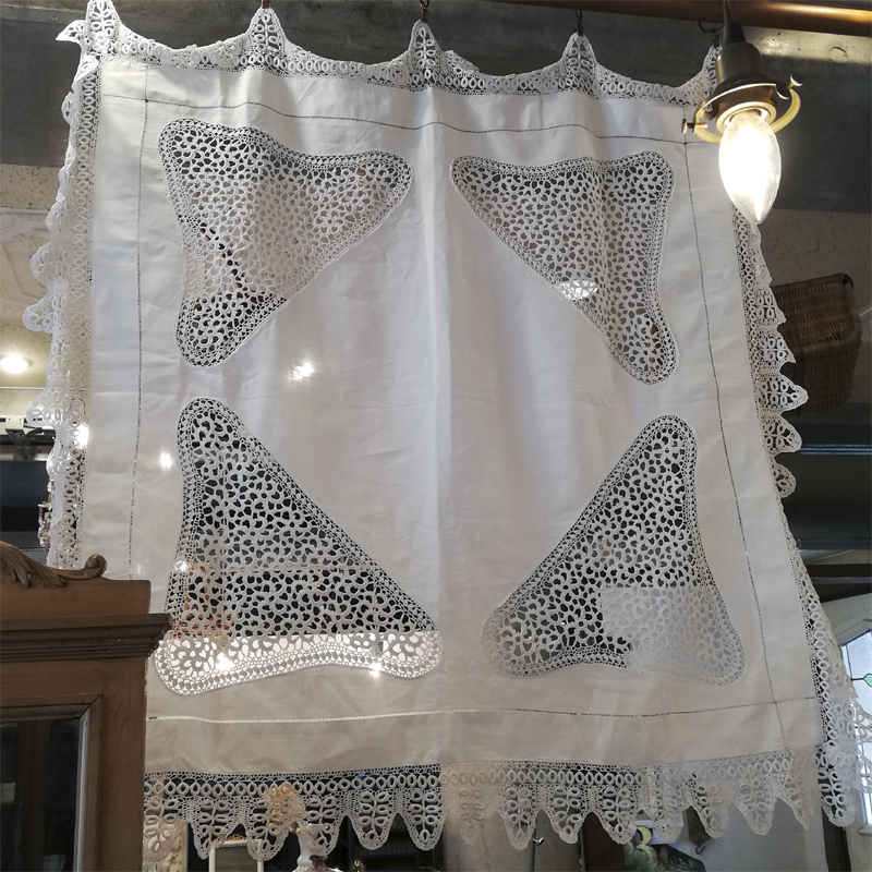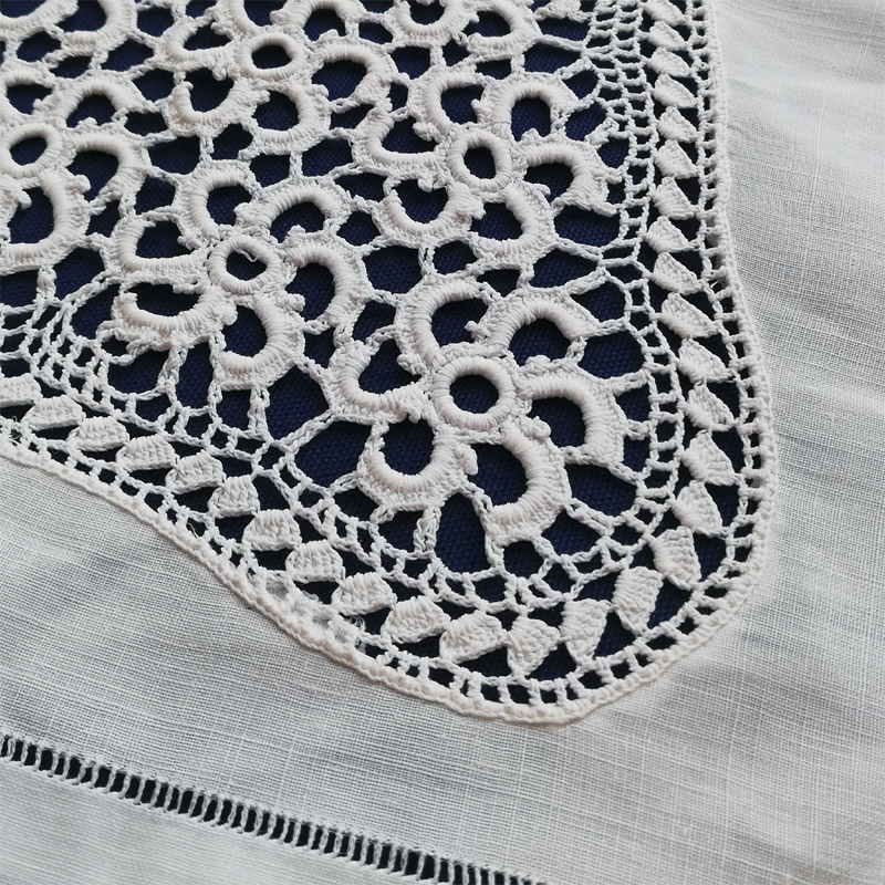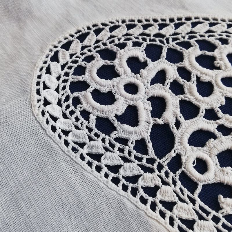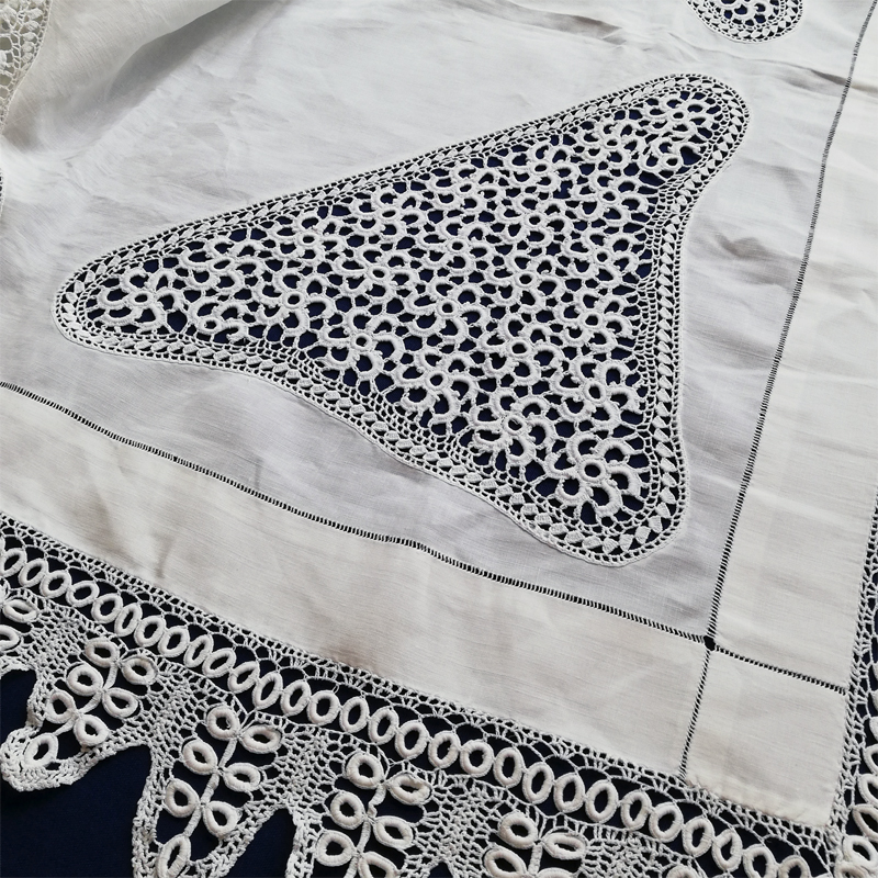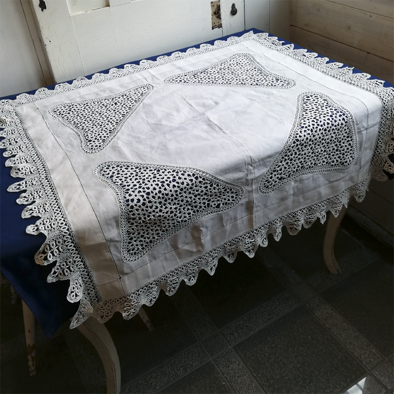張りのあるリネン地に角の無い三角形のようなクロシェレースのパーツを四箇所に入れたテーブルクロスです。クロシェレースは細いレース糸で丁寧に編まれています。
