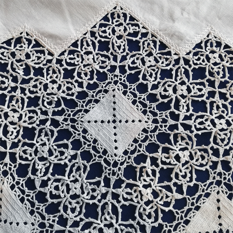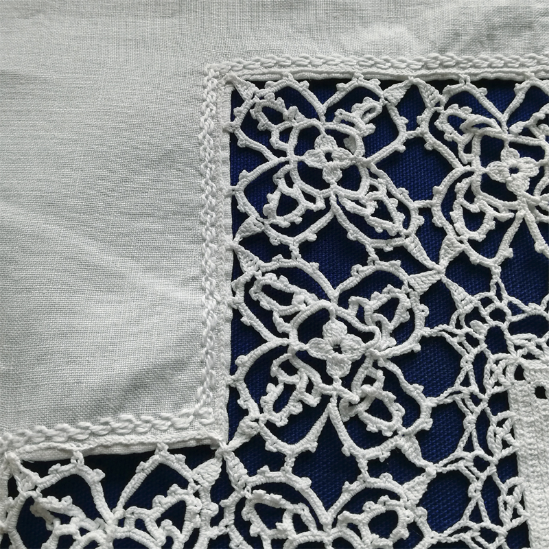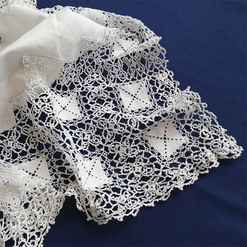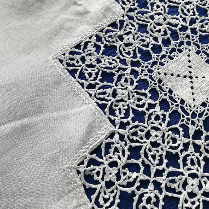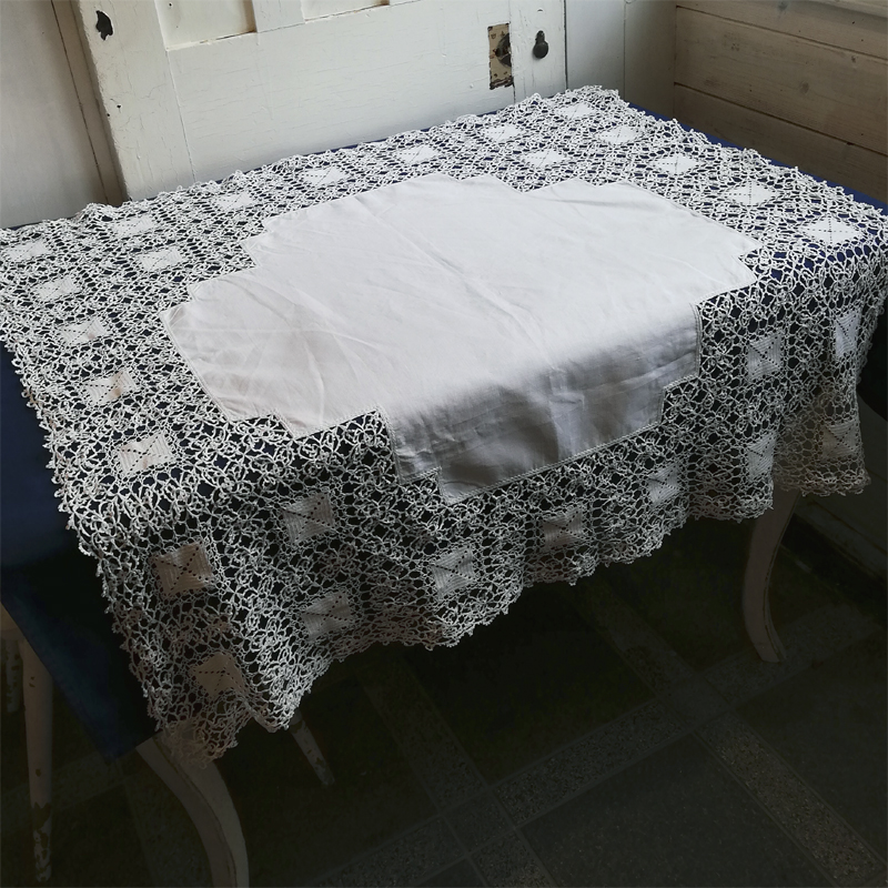 たっぷりとクロシェレースで飾られたリネンのテーブルクロスです。